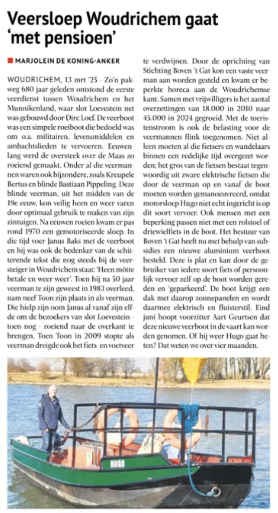 Het Altena Nieuws schreef een leuk stukje over de vervanging van de Hugo: Het iconische voetveer tussen Woudrichem en het Munnikenland, dat al sinds 680 jaar over de Maas vaart, gaat binnenkort met pensioen. Na tientallen jaren trouwe dienst, waaronder de zorg voor de oversteek van militaire en andere belangrijke goederen, wordt de oude veerboot vervangen door een moderne en duurzame versie.